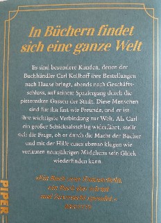 Die Hauptperson des Romans, der Buchhändler Carl Kollhoff, ist eine beeindruckende Persönlichkeit. Er bringt besonderen Kunden regelmäßig die bestellten Bücher persönlich nach Hause. Seine Beweggründe und die sich langsam entwickelnde Freundschaft zu der neunjährigen Schascha, die ihn fortan begleitet, werden ausführlich und mit warmen Worten beschrieben.
